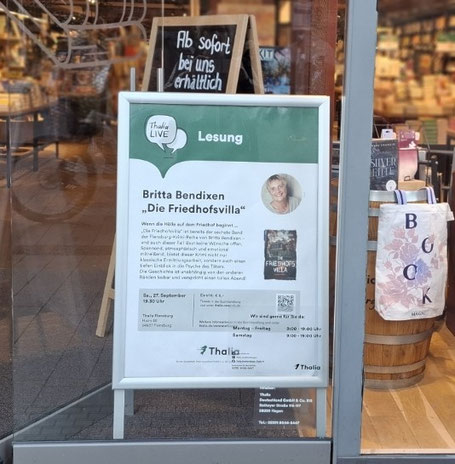Das Thalia-Team konnte einige Bücher an die LeserInnen bringen, und beim Signieren ergab sich das eine oder andere nette Gespräch. Eine Instagramm-Bekannte (@bücherela) war ebenfalls gekommen, ihren Ehemann im Schlepptau. Sie hat das Buch bereits gelesen und rezensiert. Umso mehr habe ich mich gefreut, dass sie trotzdem gekommen ist - wie ich erfuhr in der Hoffnung, die ersten vier Bände der Reihe mitnehmen zu können. Da aber nur meine letzten beiden Krimis (die sie bereits kennt) angeboten wurden, kamen wir überein, dass sie die Bücher direkt von mir bekommt. Bücherela hat übrigens auch einige der Bilder gemacht, die ihr euch anschauen könnt, wenn ihr ein bisschen weiter nach unten scrollt.